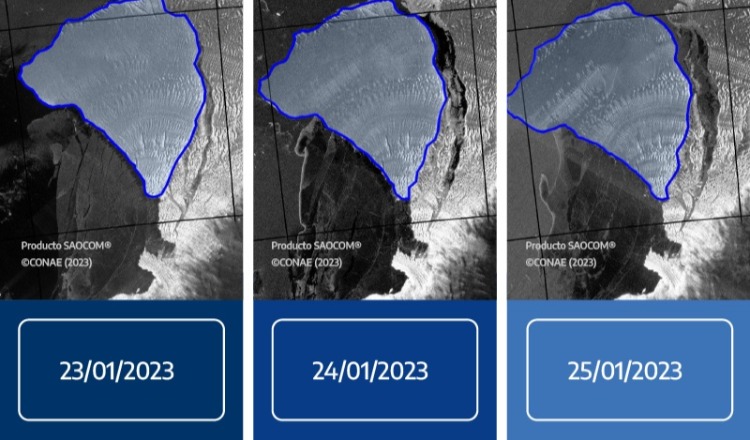 El Instituto Antártico Argentino (IAA) obtuvo las primeras imágenes satelitales nítidas del témpano que se desprendió el domingo pasado de la Antártida, que se encuentra en movimiento y es una pared que tiene 40 metros de alto, 40 kilómetros de ancho y 60 kilómetros de largo. La superficie del iceberg equivale a siete veces la Ciudad de Buenos Aires, y es monitoreado para evitar que afecte el trayecto del rompehielos en su rumbo a la...