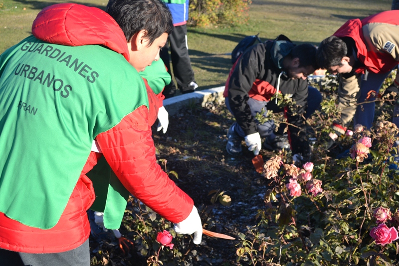 La comunidad del Centro de Actividades Alternativas para Discapacitados participó de una jornada de limpieza y desmalezamiento de los canteros y continuarán colaborando para dejar los rosales listos para la primavera. El concejal Pino, que junto a la antigua pobladora Susana Umeres, promovió la recuperación de este emblemático espacio público, destacó el trabajo realizado por los chicos del CAAD.
