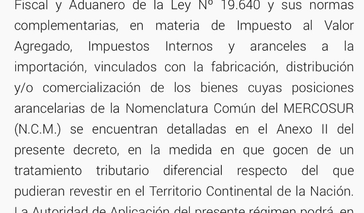 En Articulo 12 : Déjanse sin efectos los beneficios impositivos y aduaneros previsto en el régimen Especial Fiscal y aduanero de la Ley N° 19.640 y sus normas complementarias en impuesto al Valor Agregado, impuestos internos y aranceles a la importación, vinculado con la fabricación , distribución Y/o comercialización de los bienes cuyas posiciones arancelarias de la Nomenclatura Común del MERCOSUR se encuentran detalladas en el Anexo II del presente decreto, en la medida que gocen de un tratamiento tributario diferencial respecto del que pudiera revestir en el territorio Continental de la Nación.