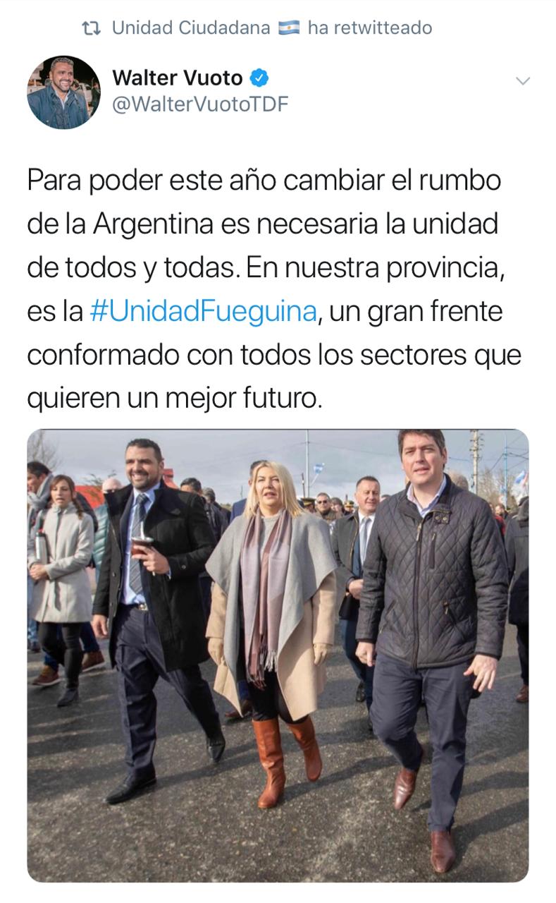 El lanzamiento de Unidad Fueguina no solo tuvo repercusión nacional, donde el hashtag #UnidadFueguina fue tendencia durante todo el día de ayer, sino que además recibió el respaldo en las redes sociales de la cuenta oficial de Unidad Ciudadana, espacio político que lidera Cristina Fernández de Kirchner.