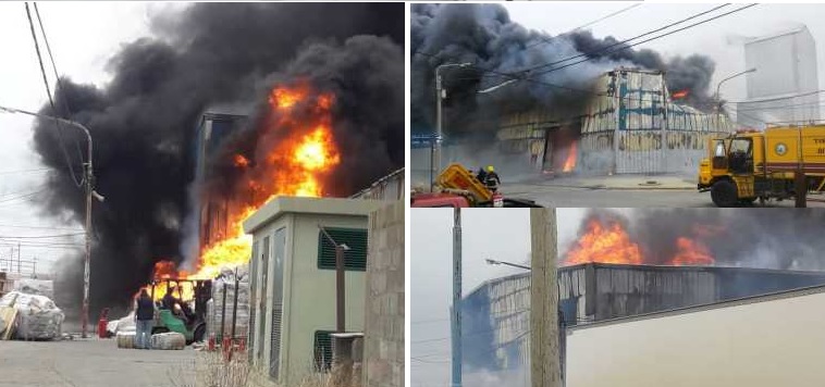 Río Grande. Aún lucha contra un enorme incendio que se desató esta tarde en la fábrica de plásticos Isla Grande, en el parque industrial de Río Grande. La situación es crítica ante los fuertes vientos que se registran en la ciudad. Video del incendio .-