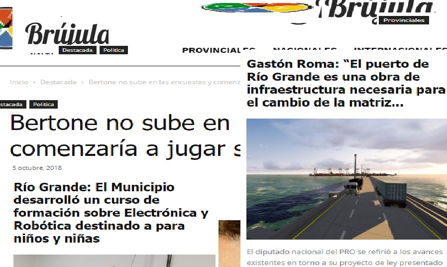 La estrategia es tan simple como burda. Un portal fantasma, una fan page y fondos públicos armaron un coctel para difundir “noticias falsas” en facebook y otras redes sociales. El medio digital denominado “Brújula” lo aporta un periodista cordobés, la estrategia en las redes la aportaría el diputado Nacional Gastón Roma y los fondos necesarios lo aportaría el Intendente Gustavo Melella. El objetivo demonizar la gestión pública de la gobernadora...