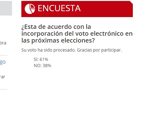La pregunta fue simple ”Está de acuerdo con la incorporación del voto electrónico en las próxima elecciones” el 61 % de los 1475 votos que hubo en la encuesta del portal dijo que SI mientras que el 38 % dijo que NO.