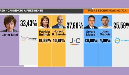 Con un piso del 35 % de los votos emitidos J. Milei se impuso en la isla. Segundo quedo UP liderada por Massa quien ganó su interna a Grabois, tercero quedo JxC con un poco más del 20 % de los votos donde ganó Patricia Bullrich a Horacio Larreta.