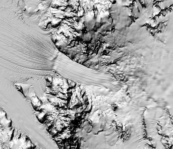 Como en el caso de la imagen de arriba, de la barrera de hielo Filchner, en la cual hay flujos entre fracturas de los montes. Estas usualmente son señales de un futuro desprendimiento total del glaciar.