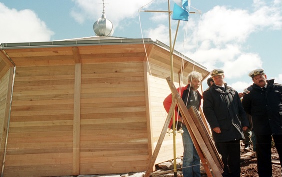Andre Bronner y su equipo festejan la finalizacion de la obra del faro del finn del mundo en 1998. Foto: Guillermo Gallardo.