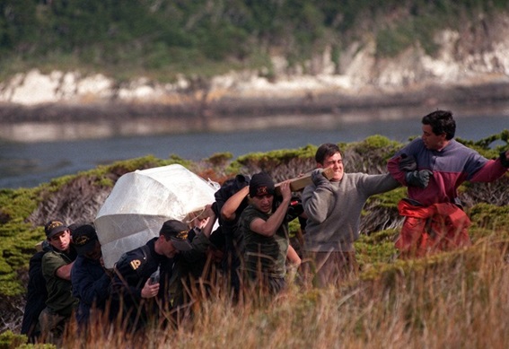 Miembros del equipo de Bronner acarrean el Faro del fin del mundo en 1998.