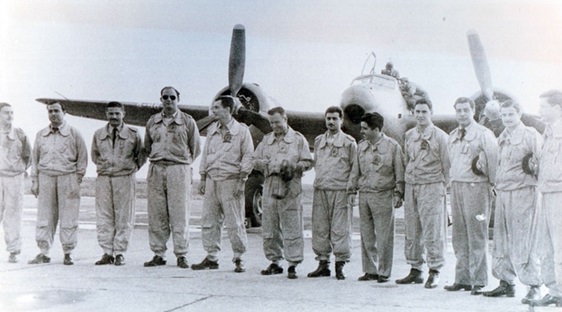 El brigadier Ernesto Crespo (quinto desde la derecha) cuando era un joven piloto de los caza Calquin en su Mendoza natal.