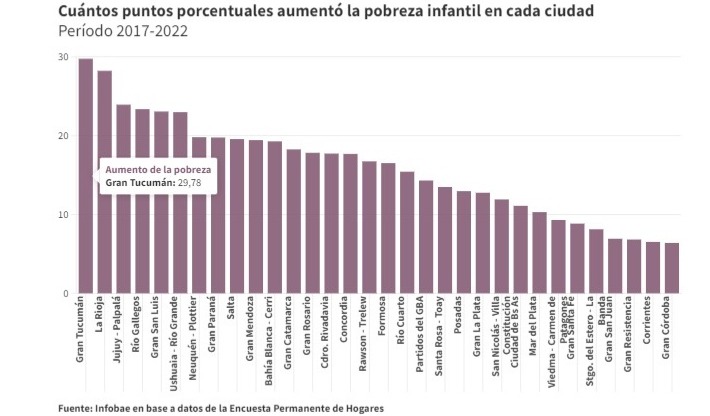 Según las estadísticas oficiales, la ciudad en la que más aumentó la pobreza infantil entre el segundo semestre de 2017 e igual mes de este año es Gran Tucumán, donde el índice se incrementó 29,78 puntos porcentuales, pasando de 30,5% a 60,2% de la población de ese grupo etario.