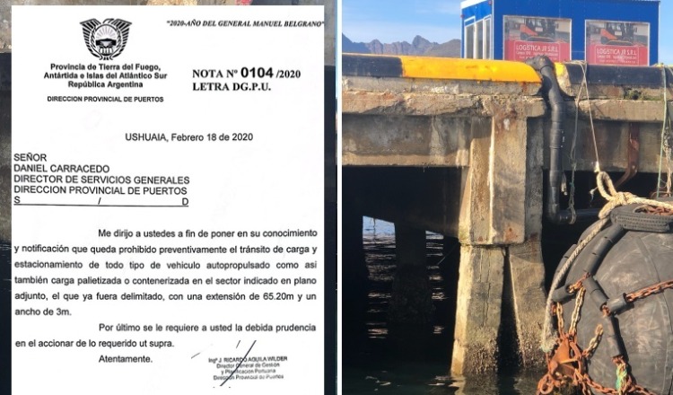La nota dirigida al presidente de la dirección de Puertos Roberto Murcia está fechada el 11 de febrero del 2020, en la cual se advierte el estado del muelle y su prohibición de circulación por un sector demarcado del mismo. Esta situación está descripta en nota y fotos, hoy en día no solo sigue igual, sino que con el correr del tiempo se agravo a punto de poner en peligro la operación de todo el muelle.