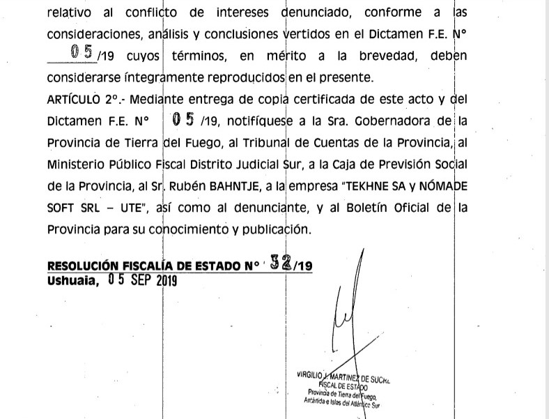 El Fiscal de Estado, Virgilio Martínez de Sucre, emitió una resolución relacionada con una denuncia por un posible conflicto de intereses en el cual habría incurrido el presidente de la Caja Previsional, Rubén Bahntje. Es por la relación contractual de la Caja con una empresa de la cual el propio Bahntje tendría relación. Martínez de Sucre manifiesta que el “Sr. Presidente de Ia Caja Previsional debió abstenerse de intervenir en la suscripción...